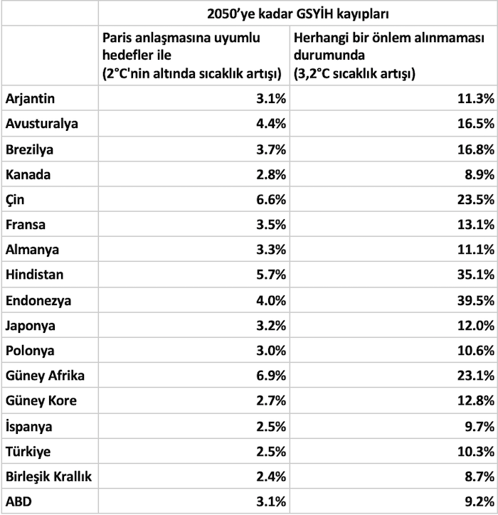 Türkiye ise Paris Anlaşması’na uyumlu hedefler benimsemesi halinde GSYİH’de kayıp riskini %2,5 ile sınırlandırabilirken, önlem alınmadığı takdirde, GSHİY’nin yaklaşık %10,3’ünü kaybetme riski taşıyor.